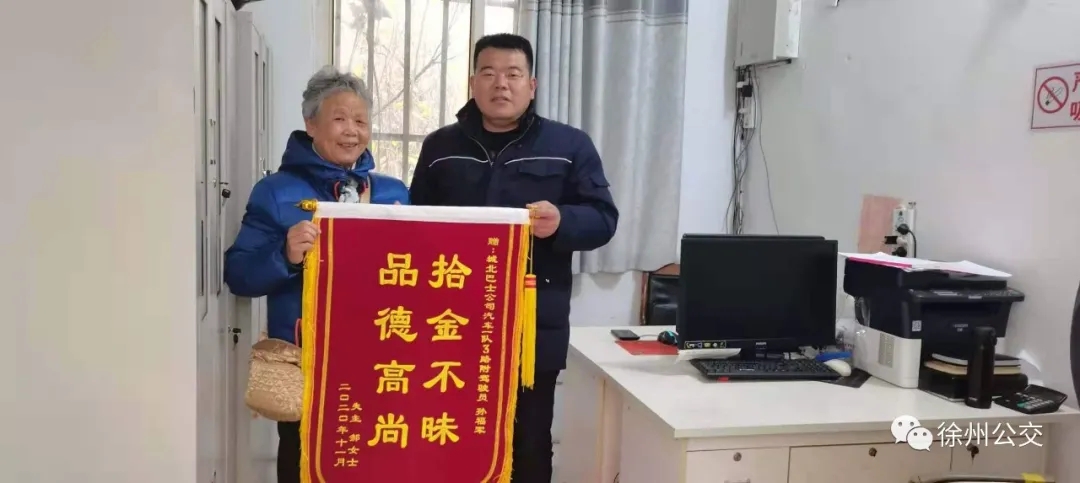 第二天,失主郝大娘來到車隊問詢,是否有駕駛員撿到一個手提袋,核對信息后,車隊工作人員將物品交還給失主??吹绞Ф鴱偷玫奈锲罚麓竽锸旨?,連聲致謝,又特意制作了一面錦旗送到車隊,再次對駕駛員拾金不昧、樂于助人的