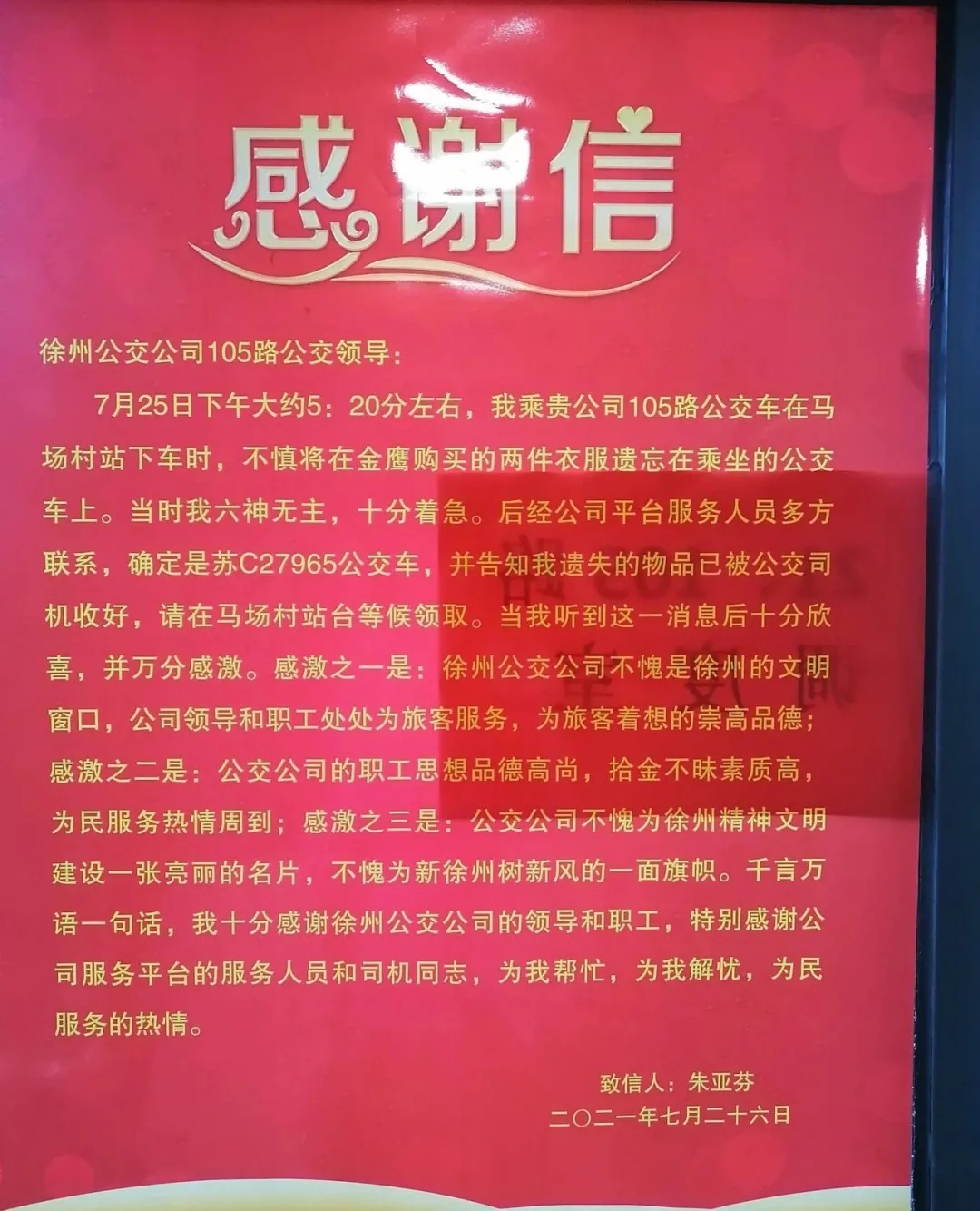“我一時疏忽丟了東西,如果沒有袁丁師傅,我這兩套西服就不知所蹤了,真的非常感謝?!?月26日,乘客朱先生送來感謝信,對徐州公交的暖心服務(wù)表示贊許。