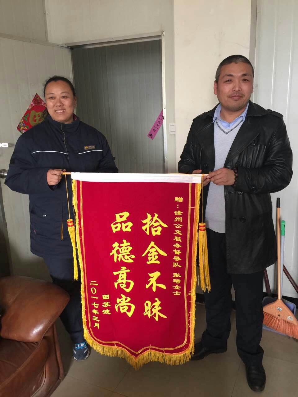 3月29日,正在站臺執(zhí)勤的督導(dǎo)員張琦撿到乘客掉落的公文包,經(jīng)查看發(fā)現(xiàn)包內(nèi)有蘋果筆記本一臺和一個錢包,但并沒有找到皮包主人的聯(lián)系方式。張琦把包放在了調(diào)度室等待失主來認(rèn)領(lǐng),約一小時后失主匆忙趕來尋找。失主見到失而復(fù)得的皮包非常激動,經(jīng)過詢問得知失主姓田在徐州礦業(yè)大學(xué)工作。田先生說,“電腦里存有非常重要的資料和聯(lián)系方式,丟包之后萬分焦急,真心感謝公交督導(dǎo)員?!彪S即從錢包里拿出400元錢塞給張琦作為答謝,張琦表示:“路不拾遺本就是自己的義務(wù),作為站臺督導(dǎo)員經(jīng)常會在站臺撿到乘客掉落的物品,不管東西貴重與否我們都會幫失主妥善保管等待認(rèn)領(lǐng)。”3月31日,田先生和他的愛人送來錦旗表示感謝!